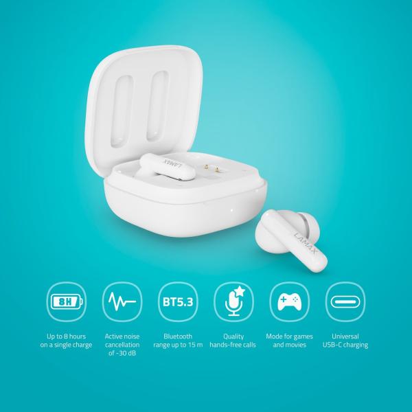 True Wireless fejhallgató LAMAX NeoPods1 ANC, Aktív Zajszűrés (ANC) -30 dB-ig, Átlátszó mód (pass-through), 8 óra akkumulátor-élettartam és összesen 42 óra hallgatási idő, a legújabb Bluetooth 5.3, játék- és filmmód alacsony késleltetéssel, kompakt mikrofon, LAMAX BeatBass® technológia, iOS-támogatás és pasztázás